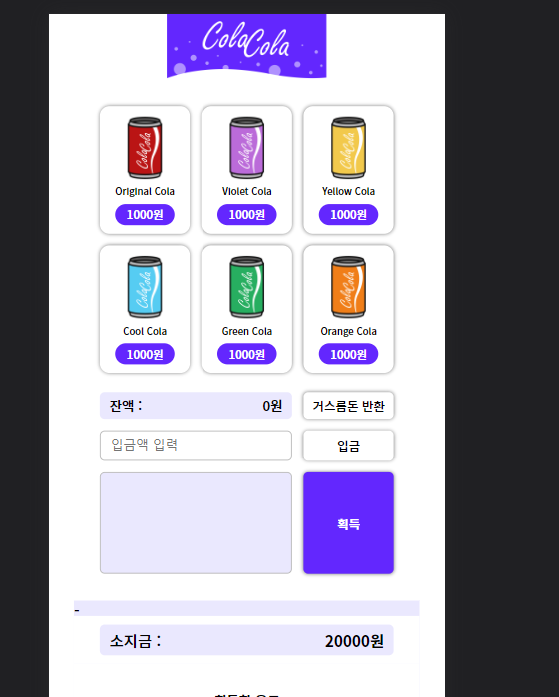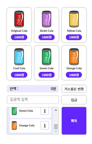 2. 콜라를 선택하고 입금된 금액한도 내에서 획득한다.