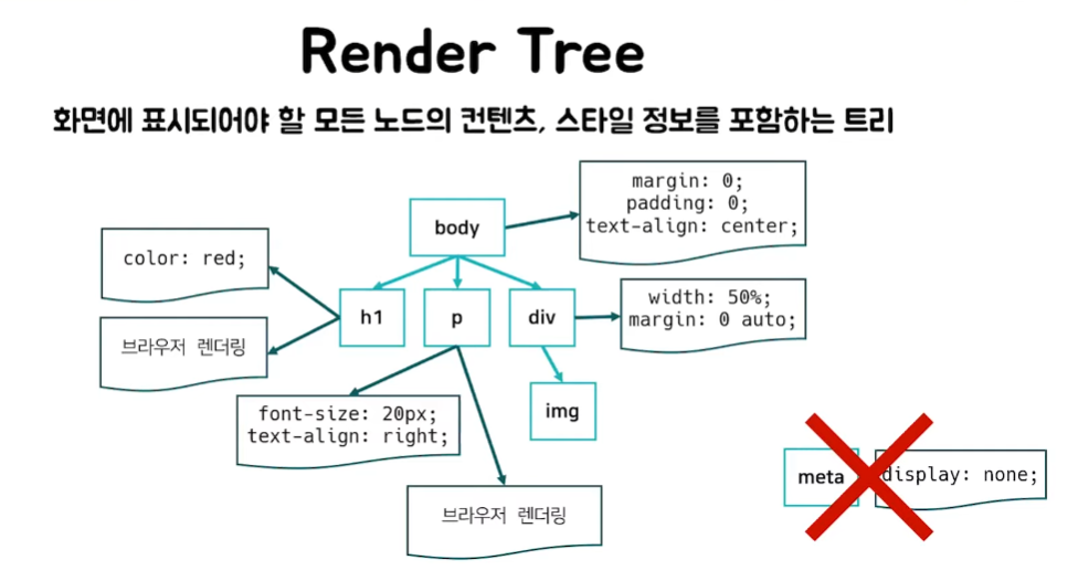 이럴때 메타 태그나 Display: none 같은 태그는 필요없기때문에 렌더트리에 포함시키지 않는다.