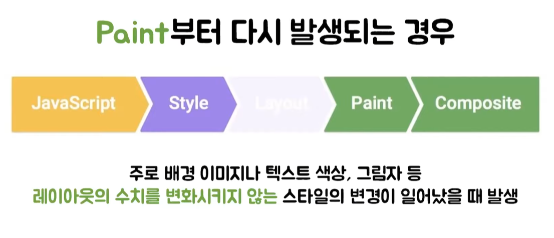 레이아웃 수치를 변화시키지 않는 스타일의 변경이 일어났을때 발생. => 레이아웃 과정이 발생하지 않기 때문에 성능상 이점이 있다.